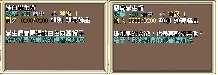 | 純白學生帽[轉向外顯頭飾] (2020.2025) | 攻擊+20、防禦+20,稱號:赤子之心 2025版追加給予特殊系對象的傷害增傷5% |