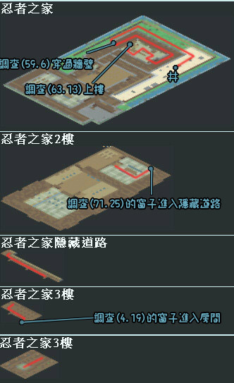 15.從(354,366)進入小路,在裡面從左上方的路進去,再從(46,23)的樓梯出去到達忍者的隱居地,再進入忍者之家